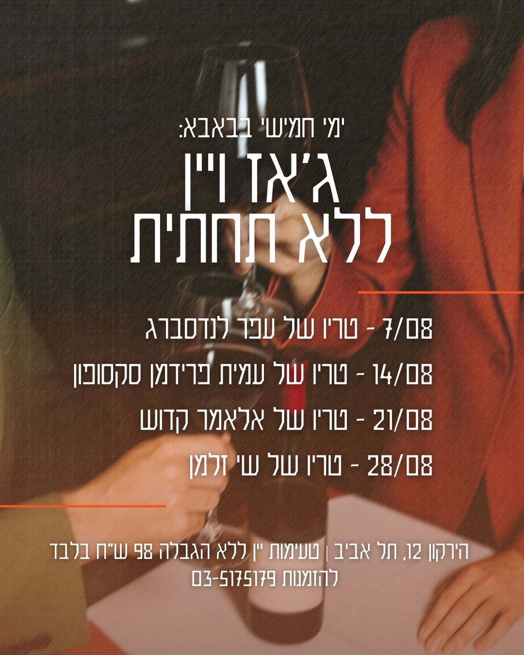 התחלה: 19:30 31.05.2025 סיום:22:30 02.06.2025 מיקום:מסעדת באבא יאגה רחוב הירקון 12- תל אביב 🇮🇱🎼🍷Вечера джаза и вина В стоимость билетов входит безлимитное вино. Тель-Авив, Ха-Яркон,
