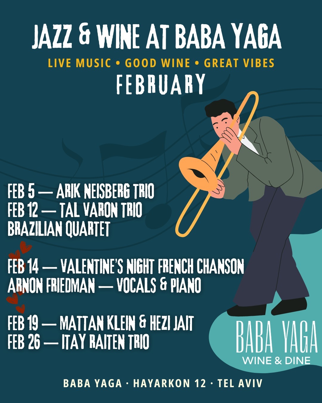 Jazz&Wine 12/25 התחלה: 19:30 04.12.2025 סיום:22:30 25.12.2025 מיקום:מסעדת באבא יאגה רחוב הירקון 12- תל אביב Comfort Music 4.12 — Квартет Матана Кляйна 11.12 ‘ Трио Шая Зельмана